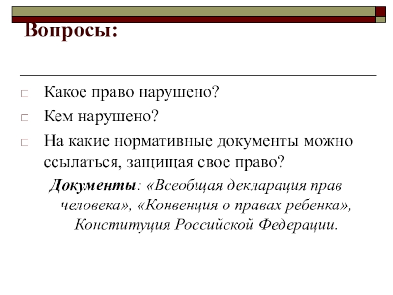 Документы: «Всеобщая декларация прав человека», «Конвенция о правах ребенка», Конституция Российской Федерации.