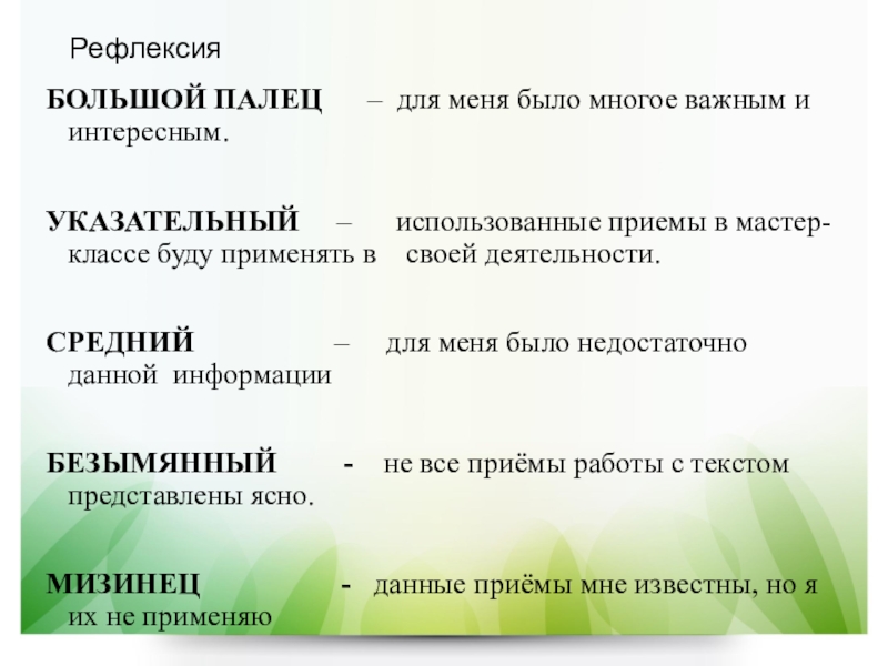 УКАЗАТЕЛЬНЫЙ – использованные приемы в мастер-классе буду применять в своей деятельности.