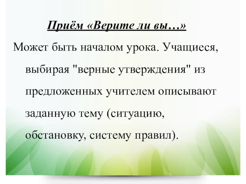 Слайд 7Приём «Верите ли вы…»