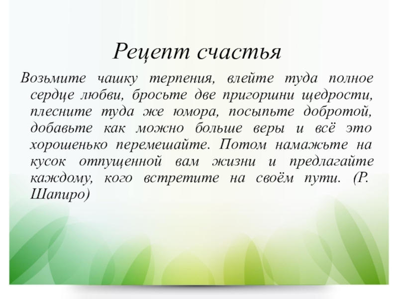 пригоршни щедрости, плесните туда же юмора, посыпьте добротой, добавьте как можно больше веры и всё это хорошенько перемешайте. Потом намажьте на кусок отпущенной вам жизни и предлагайте каждому, кого встретите на своём пути. (Р.Шапиро)