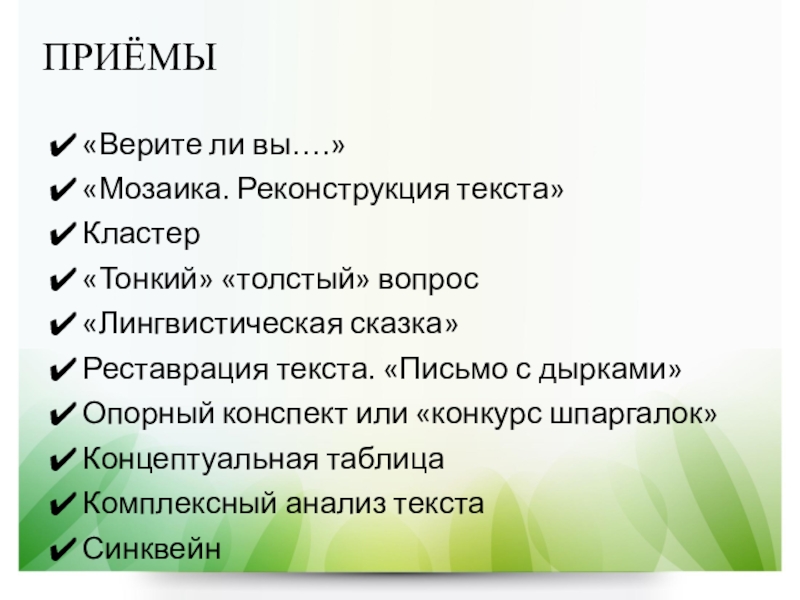 Слайд 8ПРИЁМЫ РАБОТЫ С ТЕКСТОМ