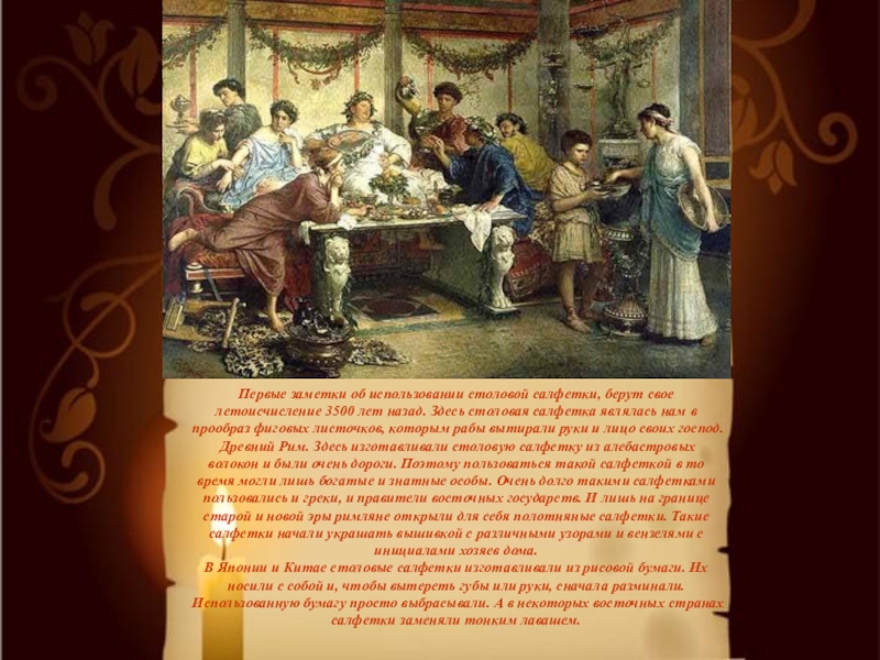 Первые заметки об использовании столовой салфетки, берут свое летоисчисление 3500 лет назад. Здесь столовая салфетка являлась нам в прообраз фиговых листочков, которым рабы вытирали руки и лицо своих господ.
