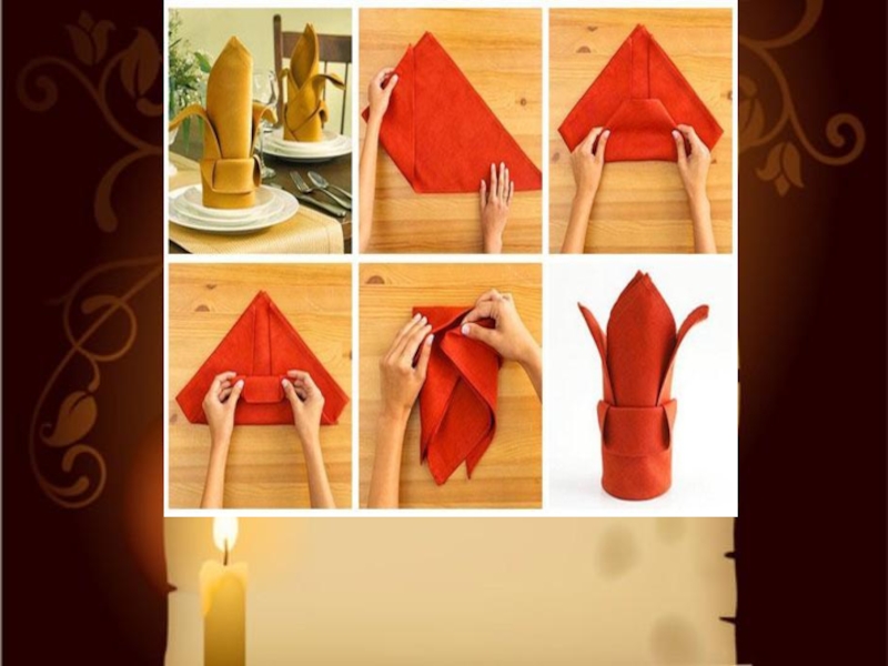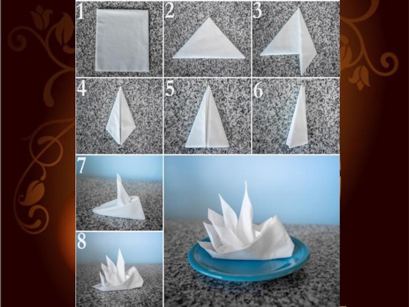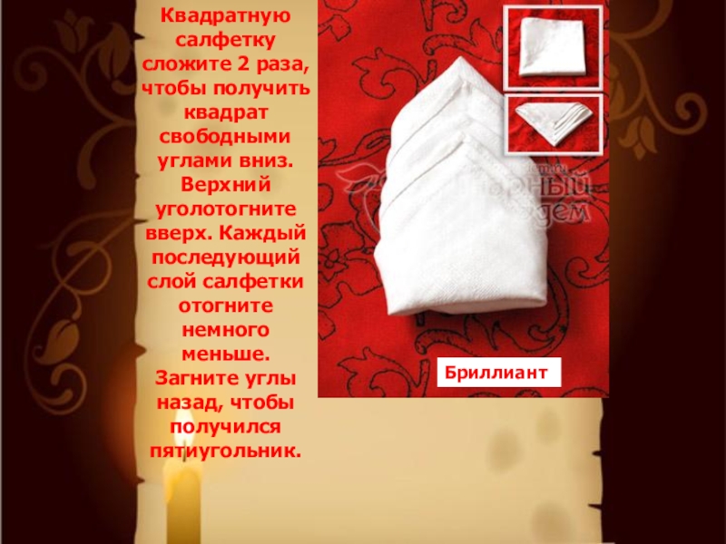 Квадратную салфетку сложите 2 раза, чтобы получить квадрат свободными углами вниз. Верхний уголотогните вверх. Каждый последующий слой салфетки отогните немного меньше. Загните углы назад, чтобы получился пятиугольник.
