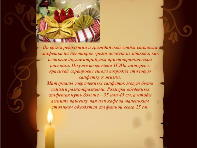 Во время революции и гражданской войны столовая салфетка на некоторое время исчезла из обихода, как и многие другие атрибуты аристократической роскоши. Но уже во времена НЭПа интерес к красивой сервировке стола возродил столовую салфетку к жизни.