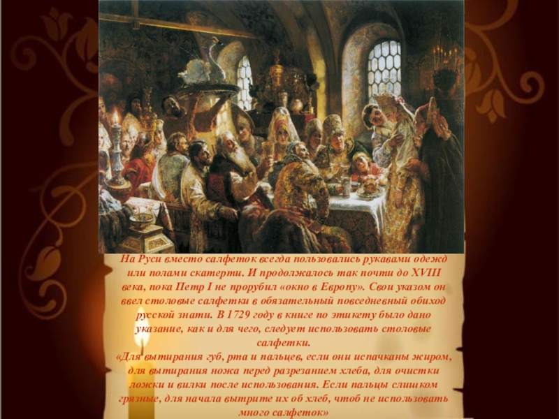 На Руси вместо салфеток всегда пользовались рукавами одежд или полами скатерти. И продолжалось так почти до XVIII века, пока Петр I не прорубил «окно в Европу». Свои указом он ввел столовые салфетки в обязательный повседневный обиход русской знати. В 1729 году в книге по этикету было дано указание, как и для чего, следует использовать столовые салфетки.
