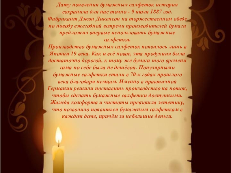 Дату появления бумажных салфеток история сохранила для нас точно - 9 июля 1887 год. Фабрикант Джон Дикенсон на торжественном обеде по поводу ежегодной встречи производителей бумаги предложил впервые использовать бумажные салфетки.