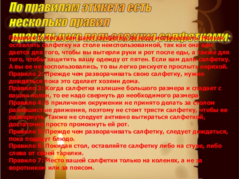 Правило 1: Когда вам дают салфетку, ее надо использовать. Нельзя оставлять салфетку на столе неиспользованной, так как она вам дается для того, чтобы вы вытерли руки и рот после еды, а также для того, чтобы защитить вашу одежду от пятен. Если вам дали салфетку. А вы ее не воспользовались, то вы легко рискуете прослыть неряхой.