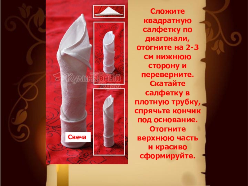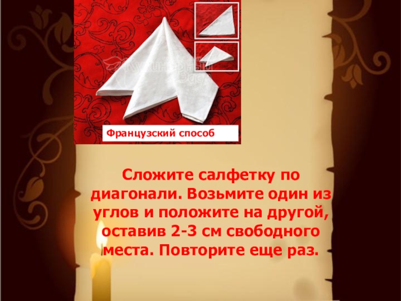 Сложите салфетку по диагонали. Возьмите один из углов и положите на другой, оставив 2-3 см свободного места. Повторите еще раз.