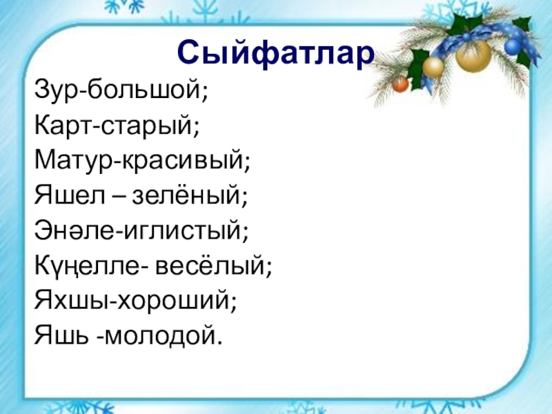 Сыйфатлар Зур-большой;Карт-старый;Матур-красивый;Яшел – зелёный;Энәле-иглистый;Күңелле- весёлый;Яхшы-хороший;Яшь -молодой.