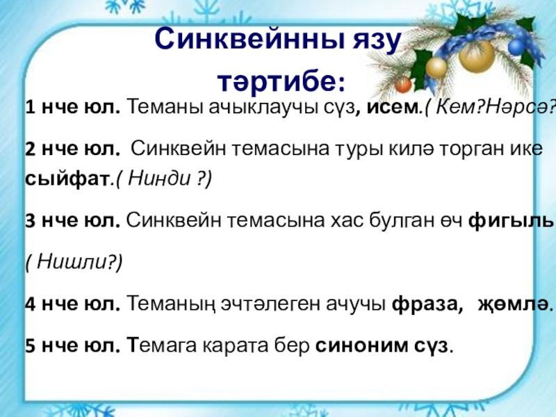 Синквейнны язу  тәртибе:1 нче юл. Теманы ачыклаучы сүз, исем.( Кем?Нәрсә?)2 нче юл.  Синквейн темасына туры килә торган ике