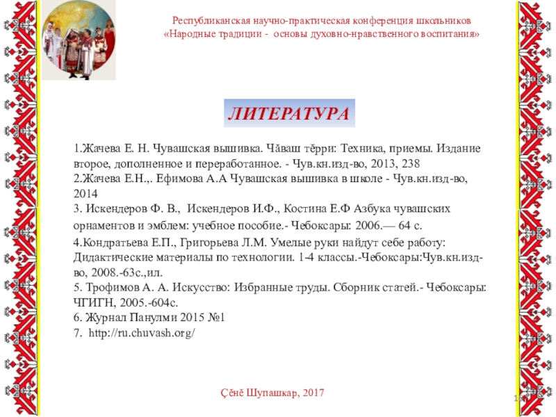 1.Жачева Е. Н. Чувашская вышивка. Чăваш тĕрри: Техника, приемы. Издание второе, дополненное и переработанное. - Чув.кн.изд-во, 2013, 238