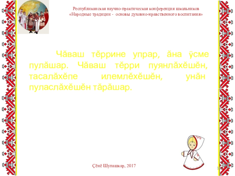 Чăваш тĕррине упрар, ăна ÿсме пулăшар. Чăваш тĕрри пуянлăхĕшĕн, тасалăхĕпе илемлĕхĕшĕн, унăн пуласлăхĕшĕн тăрăшар.