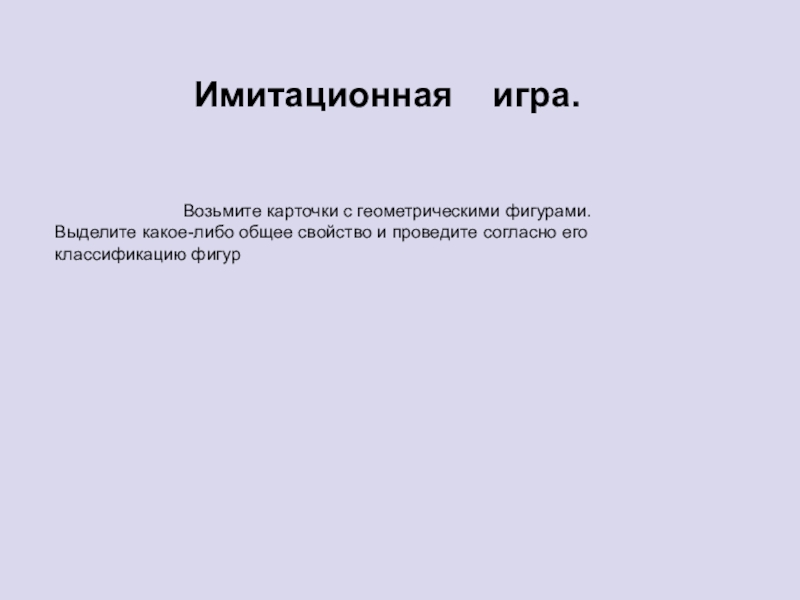 Имитационная  игра. Возьмите карточки с геометрическими фигурами. Выделите какое-либо общее свойство и проведите согласно его классификацию