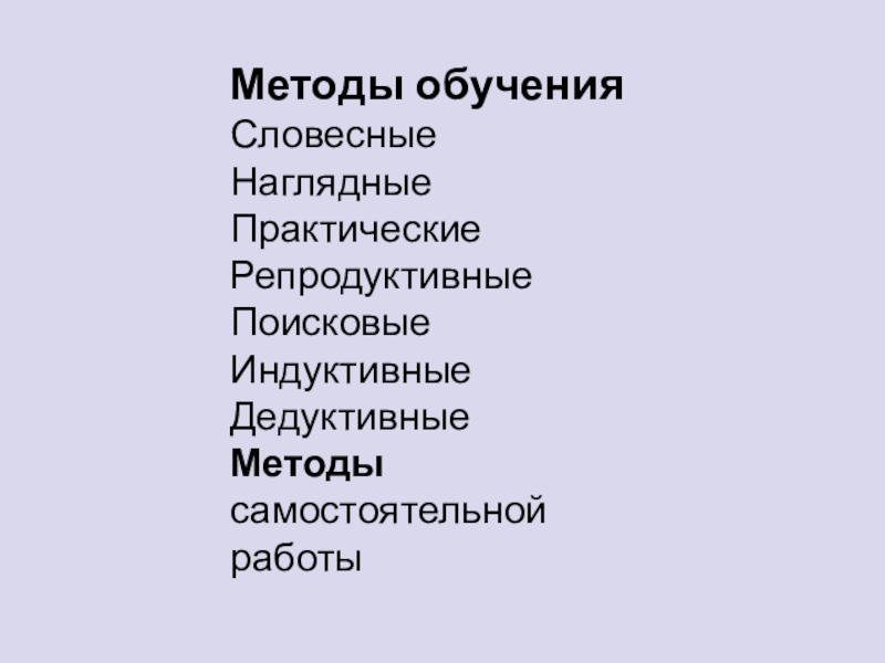 Методы обученияСловесныеНаглядныеПрактическиеРепродуктивныеПоисковыеИндуктивныеДедуктивныеМетоды самостоятельной работы