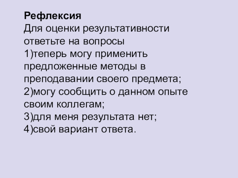 РефлексияДля оценки результативности ответьте на вопросы1)теперь могу применить предложенные методы в преподавании своего предмета;2)могу сообщить о данном