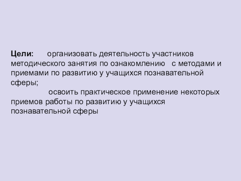 Цели: организовать деятельность участников методического занятия по ознакомлению с методами и приемами по развитию у учащихся познавательной сферы; освоить практическое применение некоторых приемов работы по