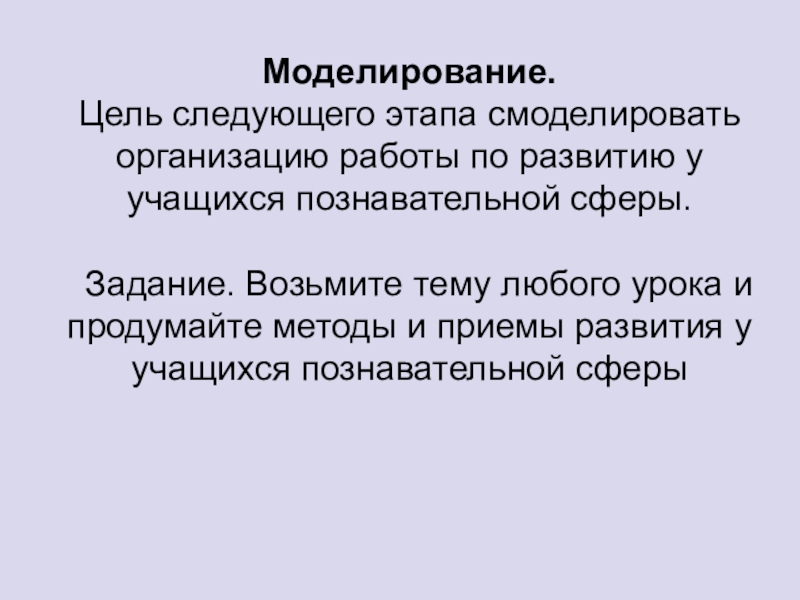 Моделирование.Цель следующего этапа смоделировать организацию работы по развитию у учащихся познавательной сферы. Задание. Возьмите тему любого урока