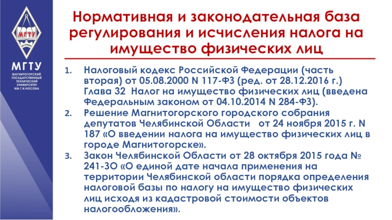 Решение Магнитогорского городского собрания депутатов Челябинской Области от 24 ноября 2015 г. N 187 «О введении налога на имущество физических лиц в городе Магнитогорске».