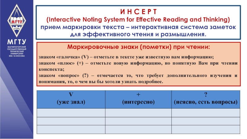 знаком «галочка» (V) – отметьте в тексте уже известную вам информацию;