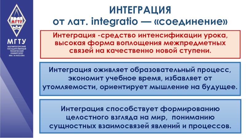Интеграция способствует формированию целостного взгляда на мир, пониманию сущностных взаимосвязей явлений и процессов.