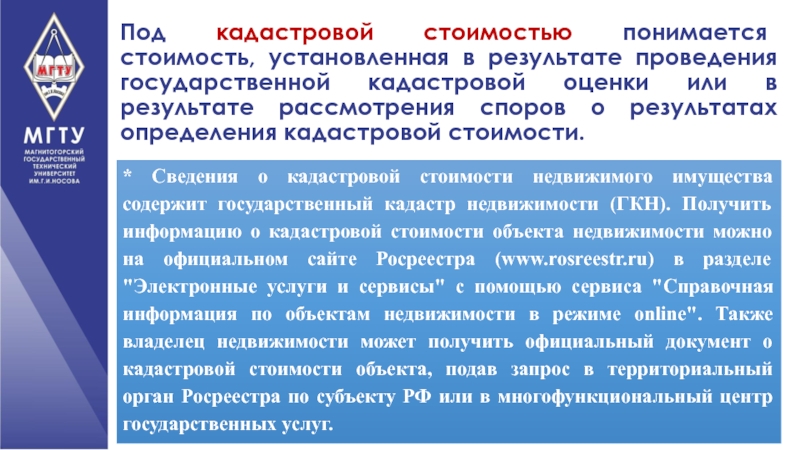 * Сведения о кадастровой стоимости недвижимого имущества содержит государственный кадастр недвижимости (ГКН). Получить информацию о кадастровой стоимости объекта недвижимости можно на официальном сайте Росреестра (www.rosreestr.ru) в разделе "Электронные услуги и сервисы" с помощью сервиса "Справочная информация по объектам недвижимости в режиме online". Также владелец недвижимости может получить официальный документ о кадастровой стоимости объекта, подав запрос в территориальный орган Росреестра по субъекту РФ или в многофункциональный центр государственных услуг.