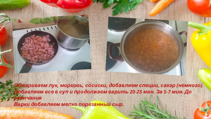 Слайд 10Обжариваем лук, морковь, сосиски, добавляем специи, сахар (немного).