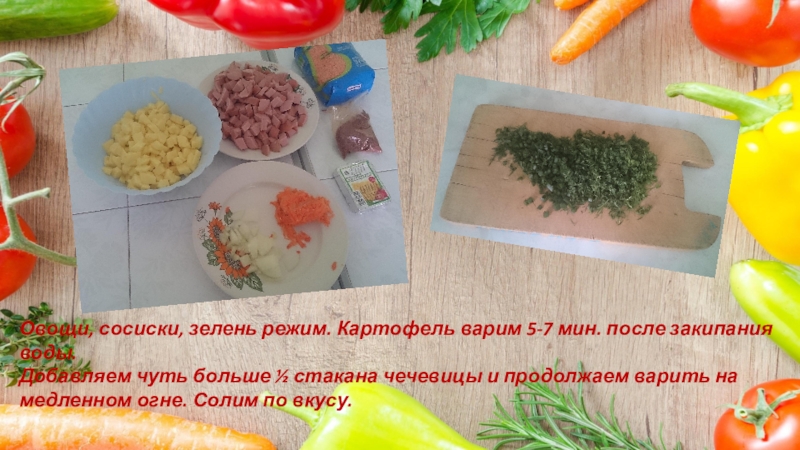 Слайд 9Овощи, сосиски, зелень режим. Картофель варим 5-7 мин. после закипания воды.