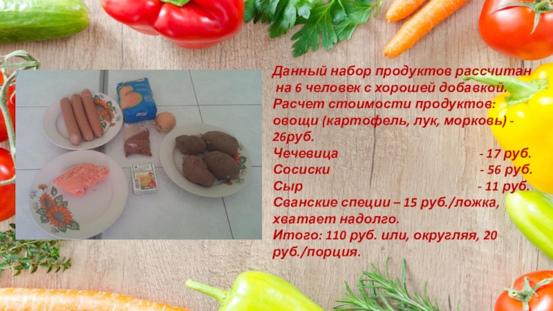 Итого: 110 руб. или, округляя, 20 руб./порция.