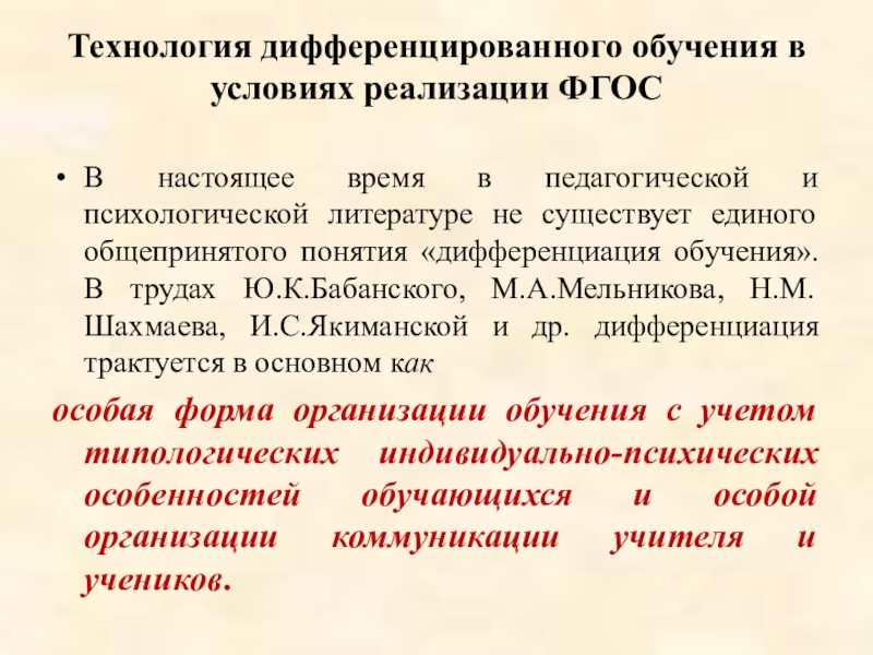 и психологической литературе не существует единого общепринятого понятия «дифференциация обучения». В трудах Ю.К.Бабанского, М.А.Мельникова, Н.М.Шахмаева, И.С.Якиманской и др. дифференциация трактуется в основном как