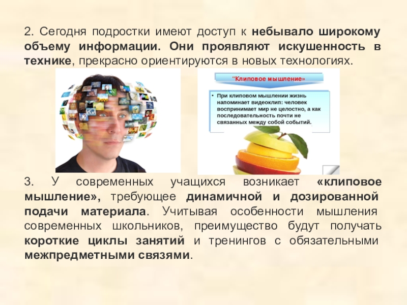 3. У современных учащихся возникает «клиповое мышление», требующее динамичной и дозированной подачи материала. Учитывая особенности мышления современных школьников, преимущество будут получать короткие циклы занятий и тренингов с обязательными межпредметными связями.