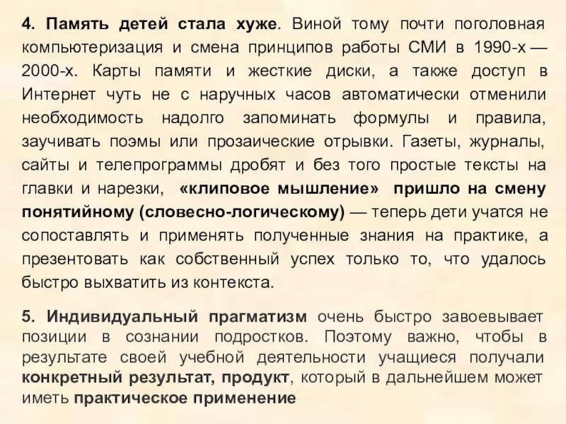 смена принципов работы СМИ в 1990-х — 2000-х. Карты памяти и жесткие диски, а также доступ в Интернет чуть не с наручных часов автоматически отменили необходимость надолго запоминать формулы и правила, заучивать поэмы или прозаические отрывки. Газеты, журналы, сайты и телепрограммы дробят и без того простые тексты на главки и нарезки, «клиповое мышление» пришло на смену понятийному (словесно-логическому) — теперь дети учатся не сопоставлять и применять полученные знания на практике, а презентовать как собственный успех только то, что удалось быстро выхватить из контекста.