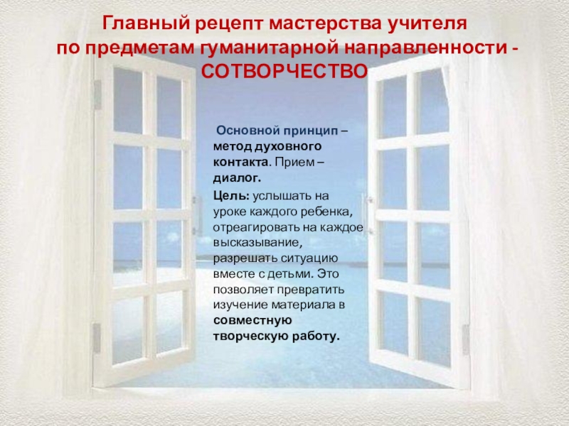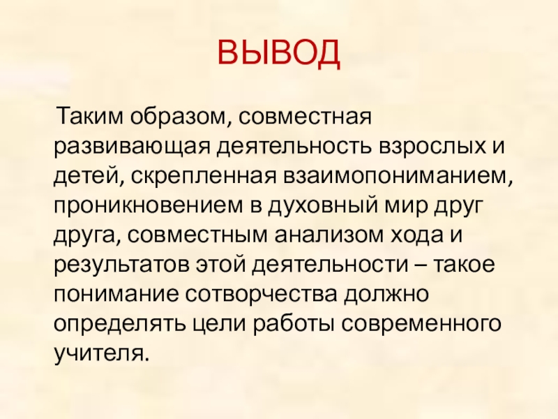 взаимопониманием, проникновением в духовный мир друг друга, совместным анализом хода и результатов этой деятельности – такое понимание сотворчества должно определять цели работы современного учителя.