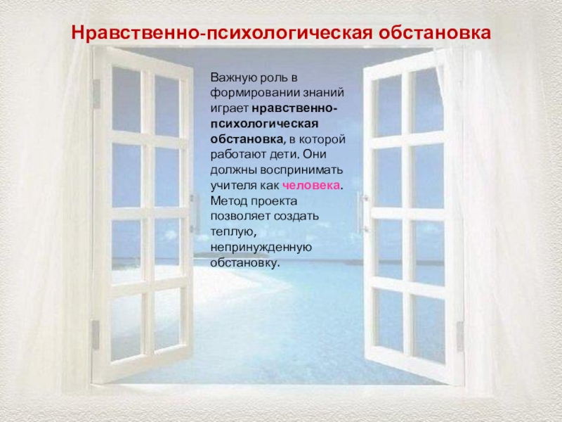 нравственно-психологическая обстановка, в которой работают дети. Они должны воспринимать учителя как человека. Метод проекта позволяет создать теплую, непринужденную обстановку.