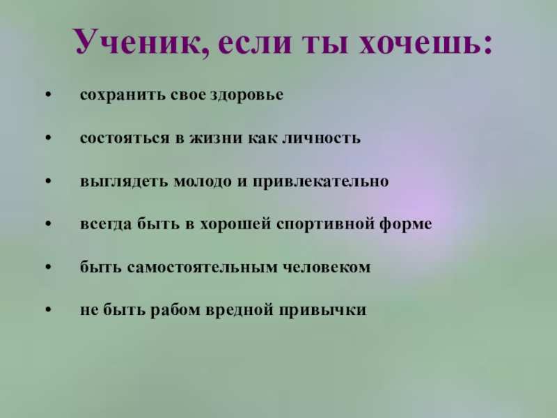 Ученик, если ты хочешь:сохранить свое здоровьесостояться в жизни как личностьвыглядеть молодо и привлекательновсегда быть в хорошей спортивной