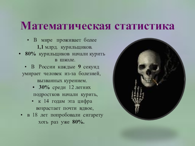 Математическая статистикаВ   мире   проживает  более    1,1 млрд.  курильщиков.80%  курильщиков  начали курить  в  школе.  В   России  каждые