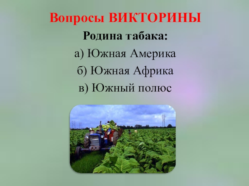 Вопросы ВИКТОРИНЫРодина табака:а) Южная Америкаб) Южная Африкав) Южный полюс