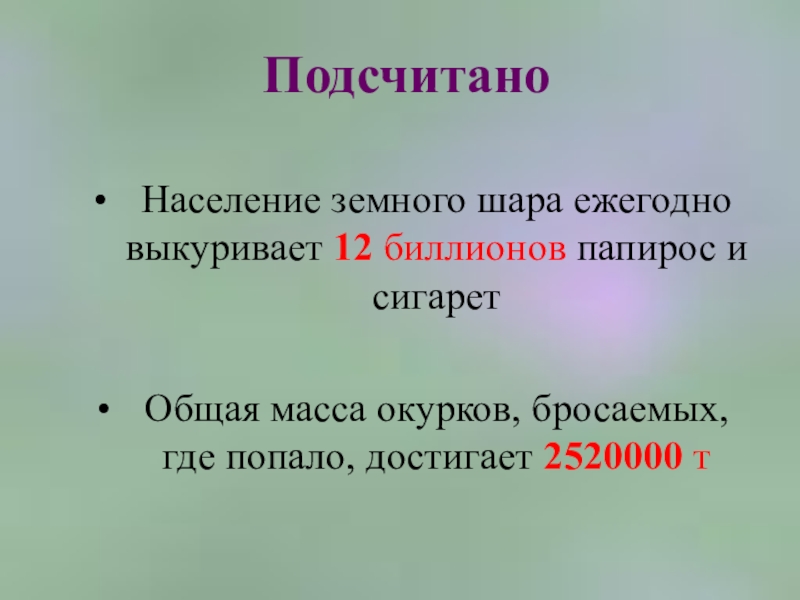 ПодсчитаноНаселение земного шара ежегодно выкуривает 12 биллионов папирос и сигаретОбщая масса окурков, бросаемых, где попало, достигает 2520000