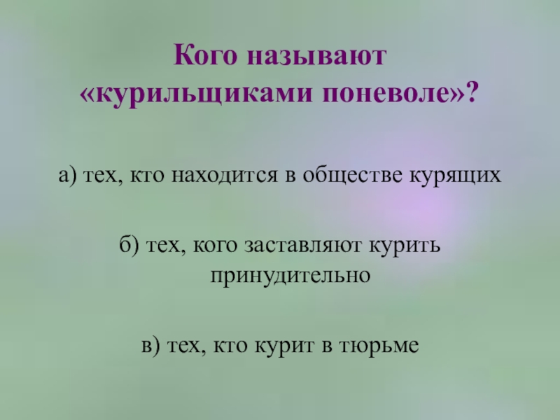 Кого называют  «курильщиками поневоле»?а) тех, кто находится в обществе курящихб) тех, кого заставляют курить принудительнов) тех,