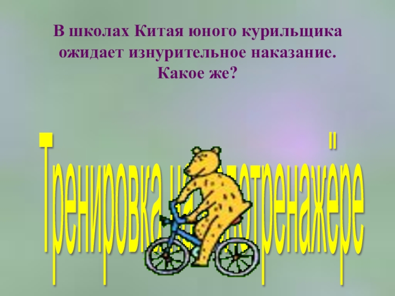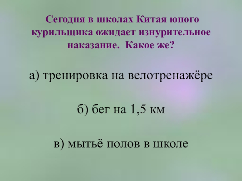 Сегодня в школах Китая юного курильщика ожидает изнурительное наказание. Какое же?а) тренировка на велотренажёреб) бег на