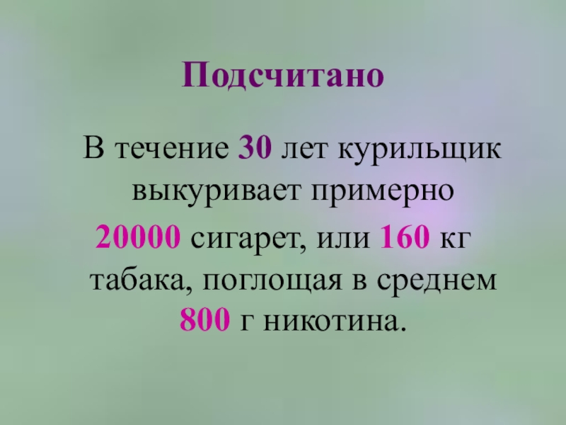 Подсчитано  В течение 30 лет курильщик выкуривает примерно 20000 сигарет, или 160 кг табака, поглощая в