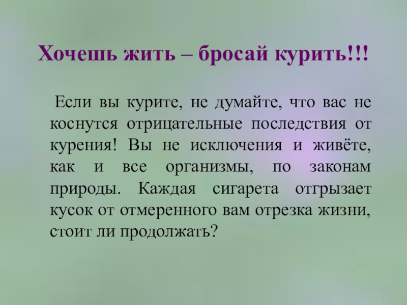 что вас не коснутся отрицательные последствия от курения! Вы не исключения и живёте, как и все организмы, по законам природы. Каждая сигарета отгрызает кусок от отмеренного вам отрезка жизни, стоит ли продолжать?