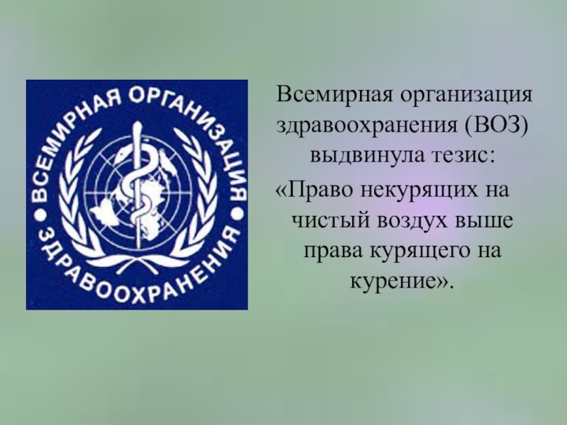 Всемирная организация здравоохранения (ВОЗ) выдвинула тезис: «Право некурящих на чистый воздух выше права курящего на