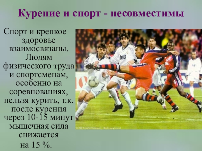 Курение и спорт - несовместимыСпорт и крепкое здоровье взаимосвязаны. Людям физического труда и спортсменам, особенно на соревнованиях,