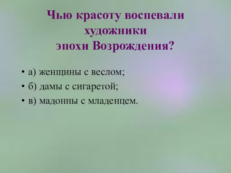 Чью красоту воспевали художники эпохи Возрождения?а) женщины с веслом;б) дамы с сигаретой;в) мадонны с младенцем.
