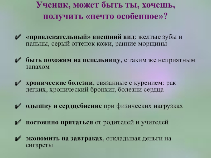 Ученик, может быть ты, хочешь, получить «нечто особенное»? «привлекательный» внешний вид: желтые зубы и пальцы, серый оттенок