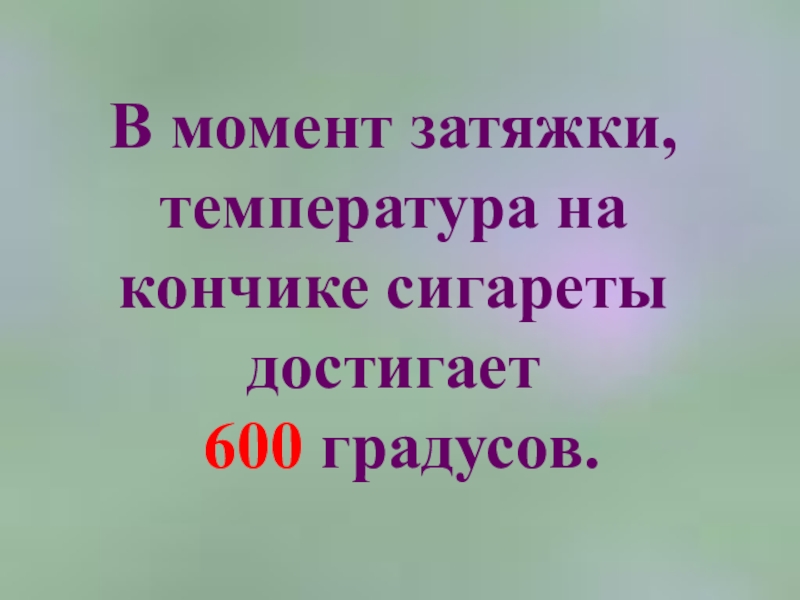 Слайд 20В момент затяжки, температура на кончике сигареты достигает 600 градусов.