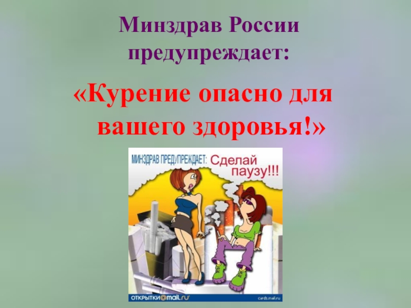Минздрав России предупреждает:«Курение опасно для вашего здоровья!»