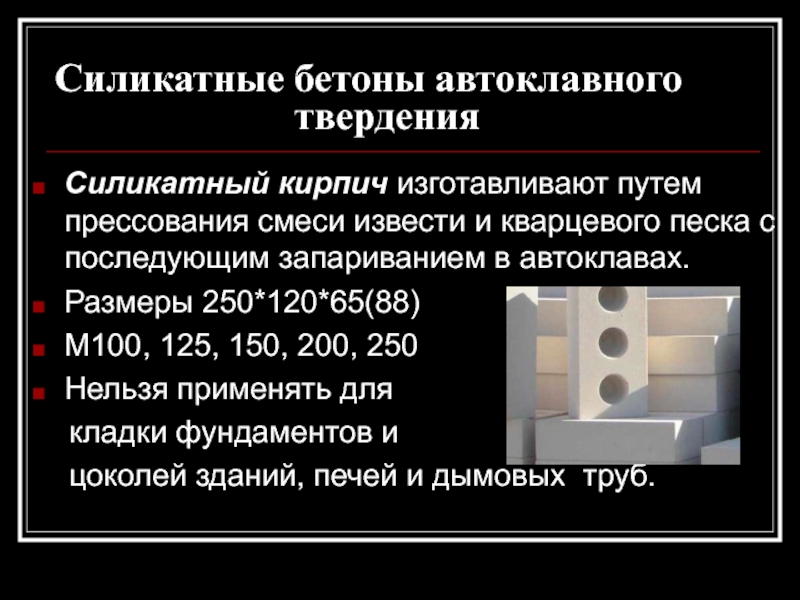 Силикатный кирпич изготавливают путем прессования смеси извести и кварцевого песка с последующим запариванием в автоклавах.