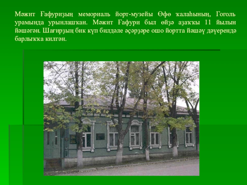 Слайд 9Мәжит Ғафуриҙың мемориаль йорт-музейы Өфө ҡалаһының, Гоголь урамында урынлашҡан. Мәжит Ғафури