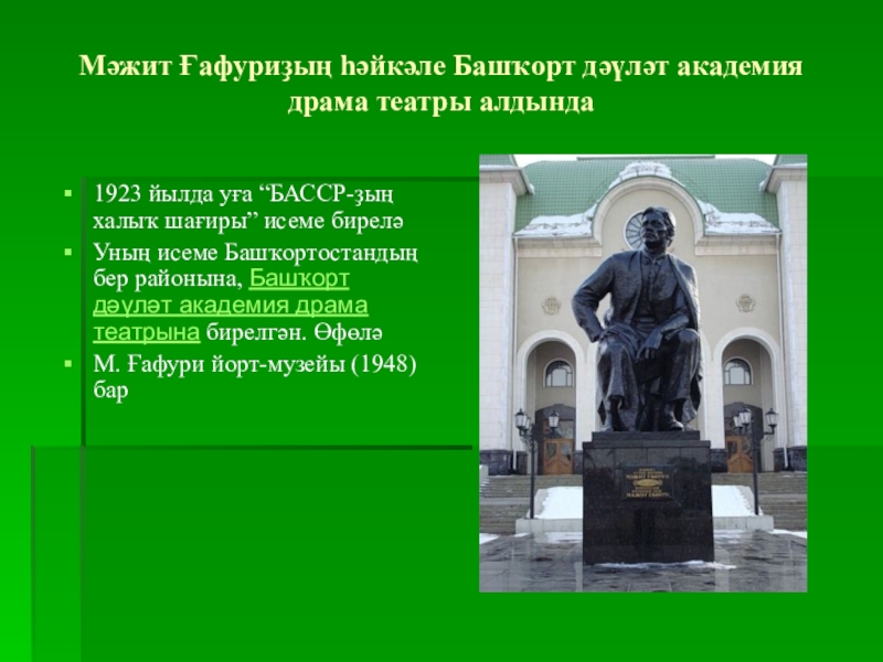 Слайд 5Мәжит Ғафуриҙың һәйкәле Башҡорт дәүләт академия драма театры алдында